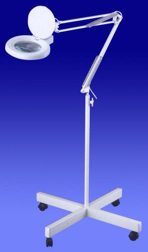 *Professional-quality magnifier lamp for medical, cosmetology and manufacturing applications*5" round glass lens, optical-quality 5-diopter magnification*22-watt fluorescent bulbs produce better working light, more efficient with less heat; UL listed*Sturdy five-leg stand with swivel caster wheels for easy mobility with excellent stability*32" spring-assisted flex arm allows exact positioning; adjustable tension & position lock. An outstanding value in a premium-quality work and task light favored by medical, dental, cosmetology and manufacturing professionals who demand high-clarity magnified and illuminated views; 22-watt fluorescent bulb (included); easy to replace. Lamp-head includes magnifying lens flip-up dust cover. UL-approved with 70" power cord, grounded 3-prong plug. Rugged steel and ABS construction; professional-looking and durable Classic White powder-coat finish is easy to clean. Maximum lamp height 64" (32" fixed-stand height + 32" flex-arm), 4-leg stand diameter 22", 27 lbs. 5-diopter lens (2.25x) has focal range of 7-9";