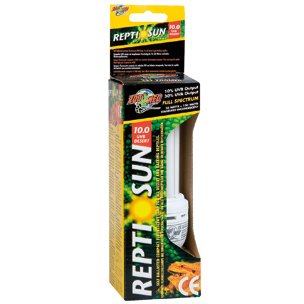 ReptiSun™ 10.0 Perfect for all desert and basking reptiles! 10% UVB Output, 30% UVA Output, FULL SPECTRUM The new ReptiSun™ Compact Fluorescent lamps use a special UVB transmitting quartz glass for maximum UVB penetration. Cool burning compact fluorescent bulbs screw into standard threaded sockets, eliminating the need for a separate ballast. Lamp can be oriented either vertically or horizontally in your reptile hood or clamp lamp fixture. UVB emissions help prevent or reverse metabolic bone disease and UVA increases feeding, mating, and other natural behaviors.